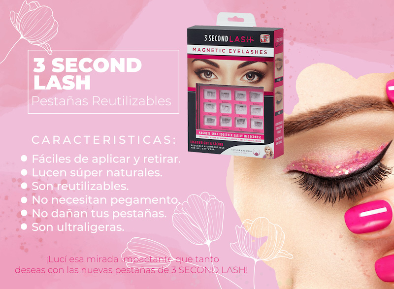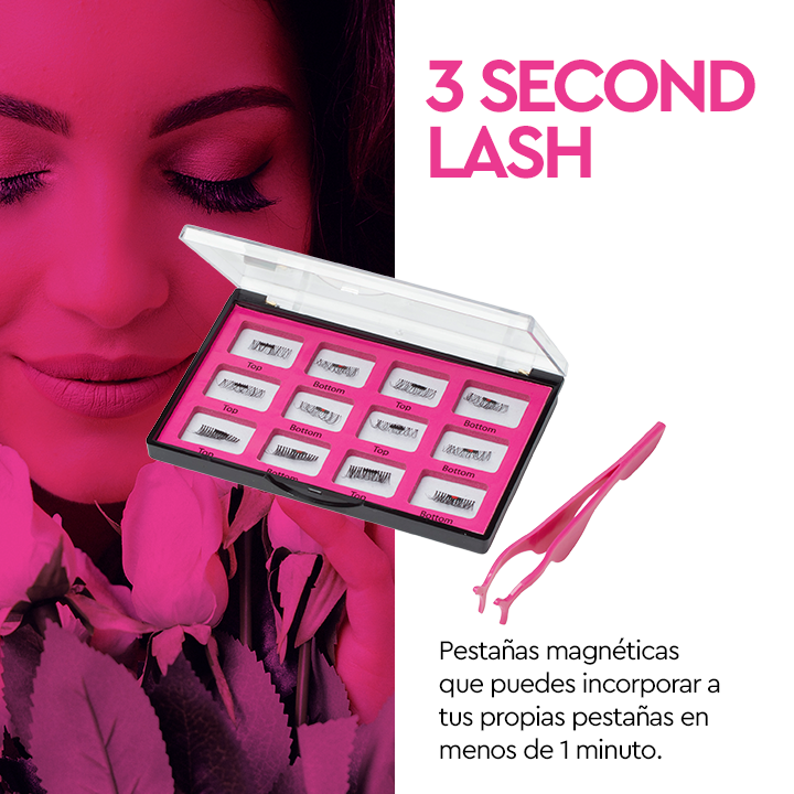 Dale volumen, curva y encanto a tu mirada en solo segundos con las pestañas magnéticas 3 SECOND LASH. Colocá una sobre tus pestañas naturales y otra por debajo: el imán hace el resto, sin necesidad de pegamento, rizadores ni máscara.